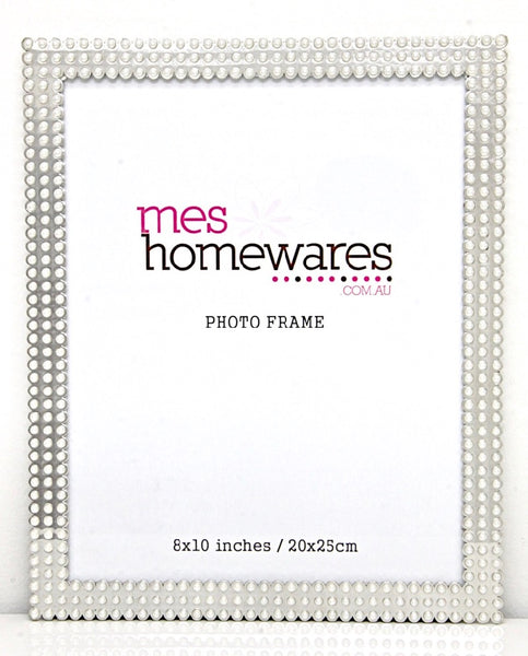 Photo frame made from pressed metal in a shiny silver embedded with faux pearls. Finished with felt style fabric backing